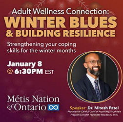 Seasonal sadness can be difficult, but resilience is a skill we can strengthen. Join the Métis Nation of Ontario on January 8 at 6:30 p.m. EST for our next Adult Wellness Connection, where we’ll explore practical strategies for coping with winter challenges and improving emotional wellbeing.