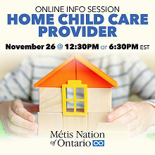 Join us on November 26 at 12:30 p.m. or 6:30 p.m. for an information session on the MNO Home Child Care Program and how to become a licensed home child care provider. Attend the session that best fits your schedule.